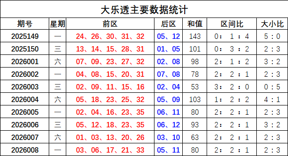 上期回来:大乐透上期奖号为:前区03 06 17 21 33,后区05 11,前区奖号和值为80,区间比2:2:1,大小比为2:3,