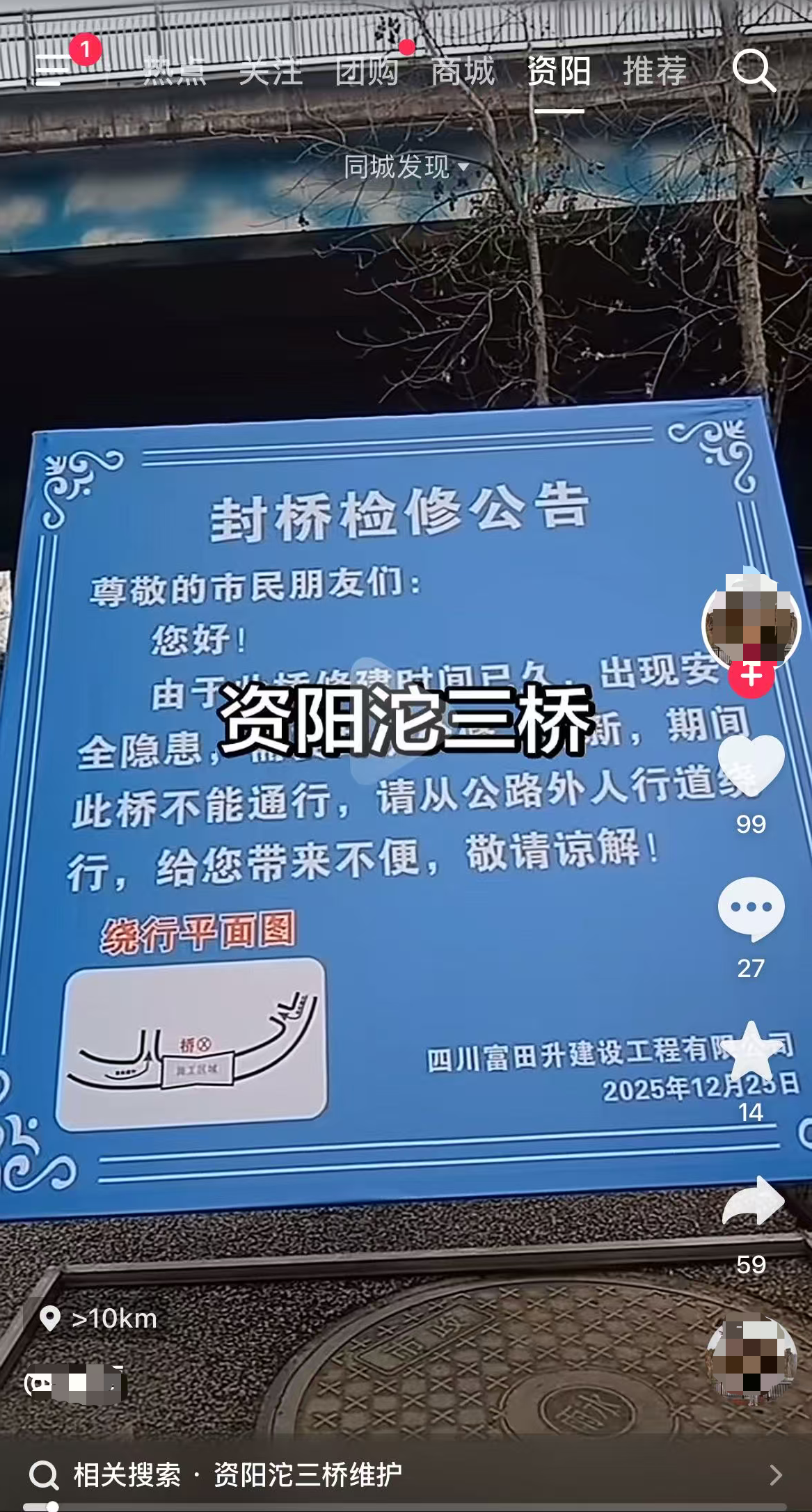 上述网友拍摄视频中,有一则封桥考试公告,其内容称“由于此桥修建时间已久,出现安全隐患,需要封桥考试、改造”。此外,该网友还配发有笔墨“资阳沱三桥”。