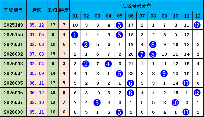 后区走势分析:上期开出05 11,开出和值16,较前一期和值高潮3个点位变化,本期瞻望和值下跌,参考号码06 08,和值14。
