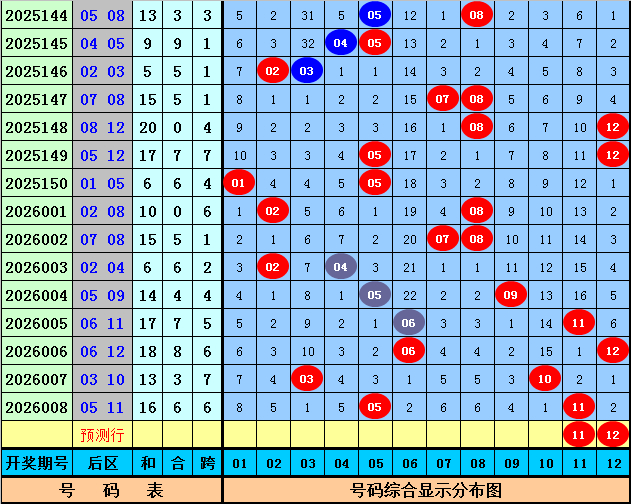 后区别析:上期后区开出全2路号码05和11,最近30期后区奖号012路比为15:17:28,最近10期后区奖号012路比为6:4:10,本期后区留意号码03、06、10、11、12,单挑两码组合11、12。