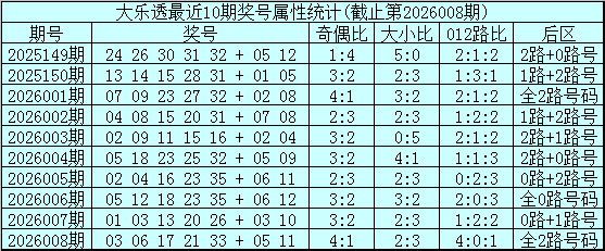 大乐透第2026008期开奖号码:03 06 17 21 33 + 05 11。前区奖号大小比为2:3,奇偶比为4:1,012路比为4:0:1,后区为全2路号码。